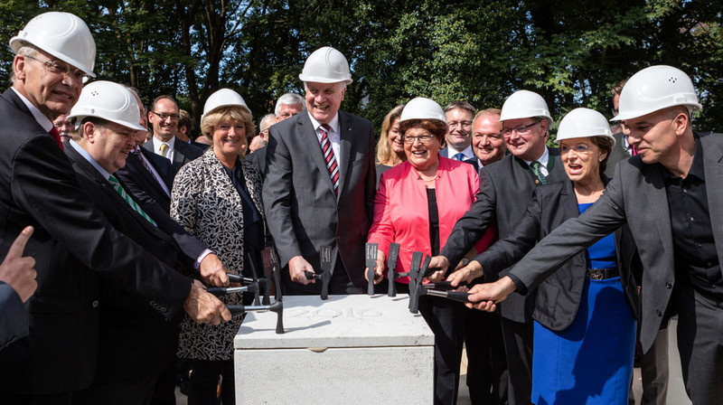 Den ersten Hammerschlag setzten Ministerpräsident Horst Seehofer, Landtagspräsidentin Barbara Stamm, der Vorsitzende des Wissenschaftlichen Beirats Prof. Dr. Hans-Martin Hinz, der Sprecher der Sudetendeutschen Volksgruppe Bernd Posselt, die Beauftragte der Bundesregierung für Kultur und Medien Staatsministerin Prof. Dr. Monika Grütters, Staatssekretär Gerhard Eck, Staatsministerin Emilia Müller und Architekt Johannes Probst.